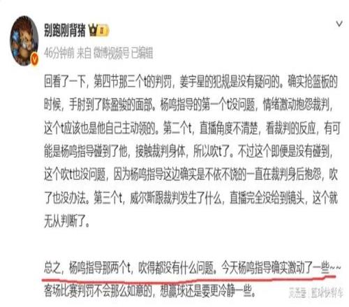 不过,在第四节还剩下6分多钟时,姜宇星与陈盈俊的一次拼抢中,姜宇星的手打到了陈盈俊,随后裁判响哨,吹罚了姜宇星犯规。这本该是一次正常不过的犯规。不过,当时站在场边的杨鸣却认为,陈盈俊这球有假摔嫌疑,姜宇星的动作并不大。随即,杨鸣直接上前找裁判理论,现场火力全开,嘴里喋喋不休的怒喷裁判。而对于见惯大场面的裁判,他们也似乎不给面子,直接吹了杨鸣一个T。